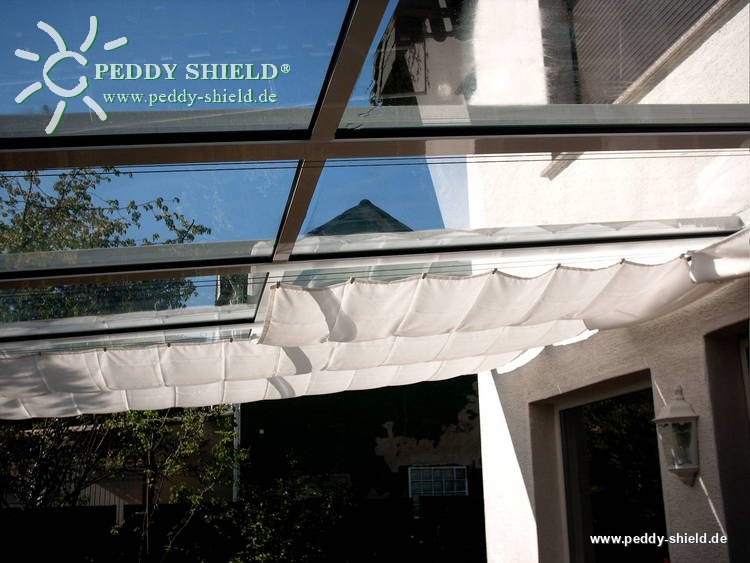 Wasbaar zonnezeil van polyesterstof, UV-bestendig, lichtgewicht en waterafstotend. 2 cm zoom aan alle zijden. Goedkope oplossing voor het afzonderlijk bespannen van vlakken van een serre, terrasoverkappingen en glasdaken, etc.