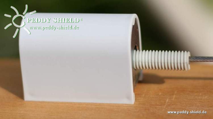 Door de smalle afdekkap een minimale lichtspleet tussen de balken en het zonnezeil.